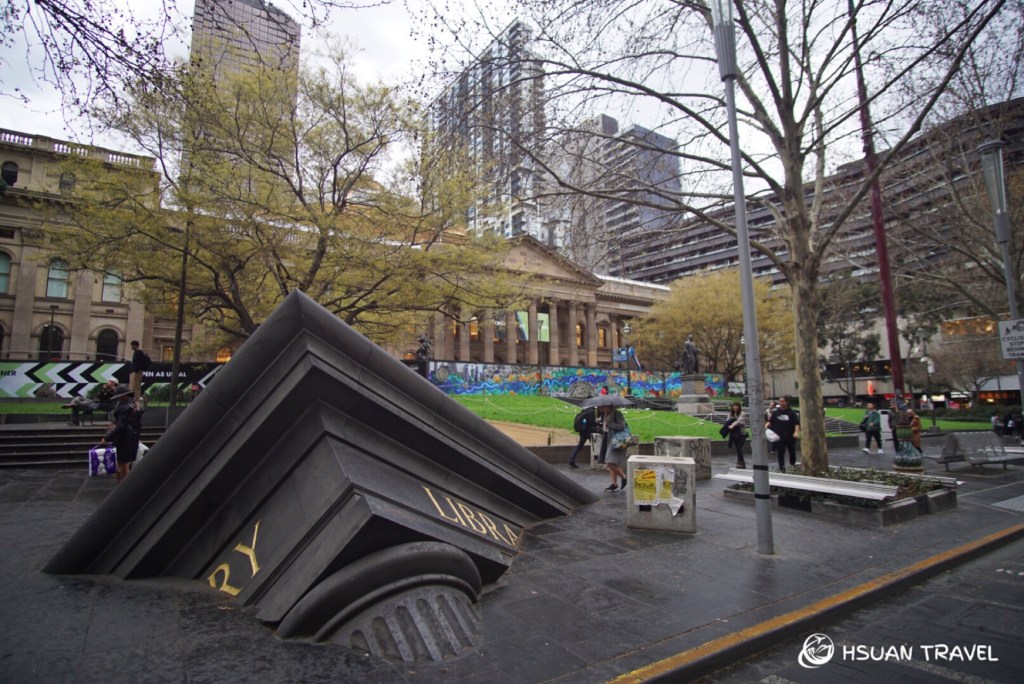 澳洲最古老,也是世界上最早的免費公共圖書館之一。圖書館前方,有一個像是崩毀掩埋的建築物遺跡,是藝術家Petrus Spronk的設計作品,名為「建築碎片」。