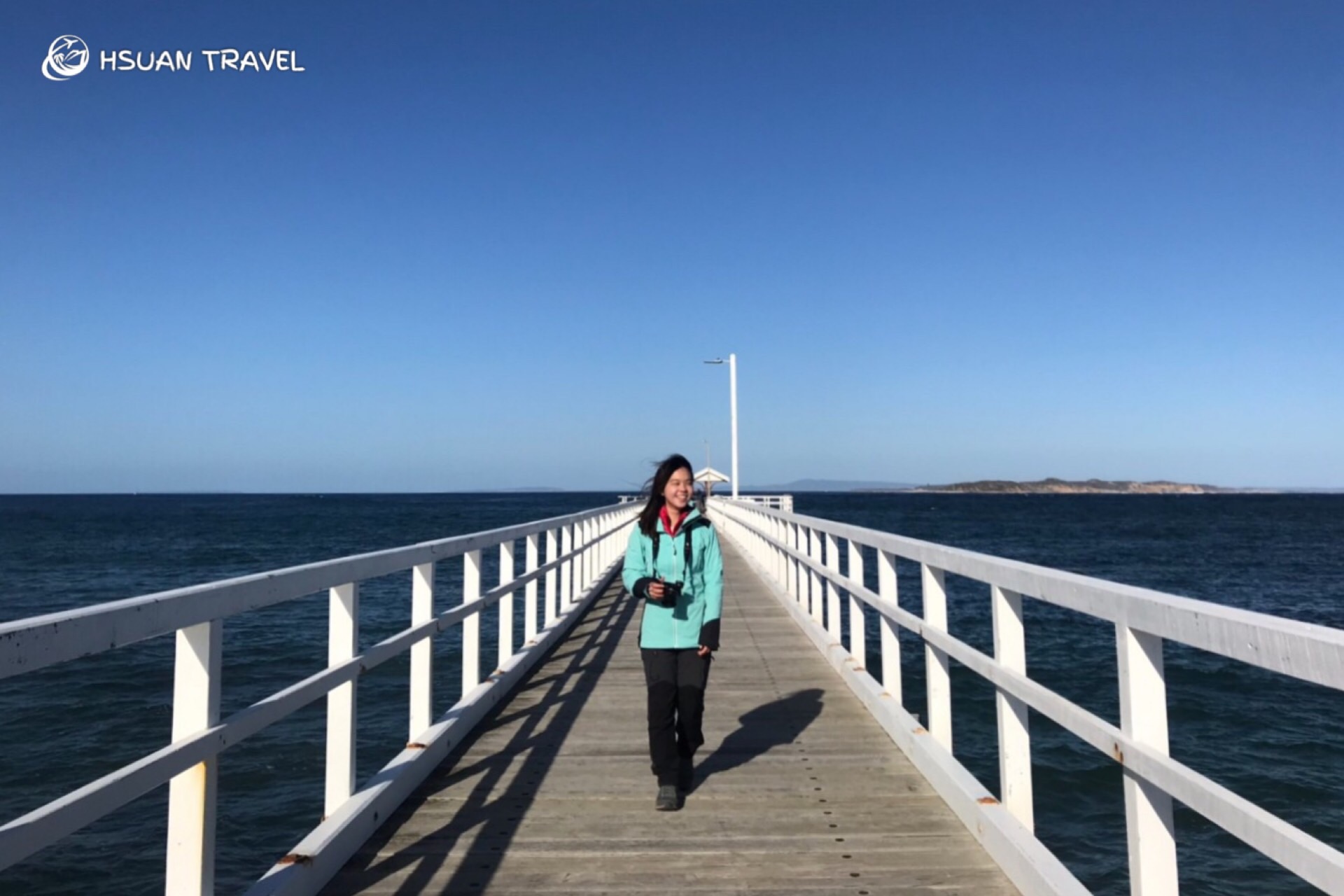 Point Lonsdale Lighthouse有一條長長的步道延伸到海上,終點是一個休憩涼亭,有人在此釣魚,有人在此靜靜坐著看海。當走在步道中央時,浪潮自兩旁襲來,像是被絕美的藍擁戴。