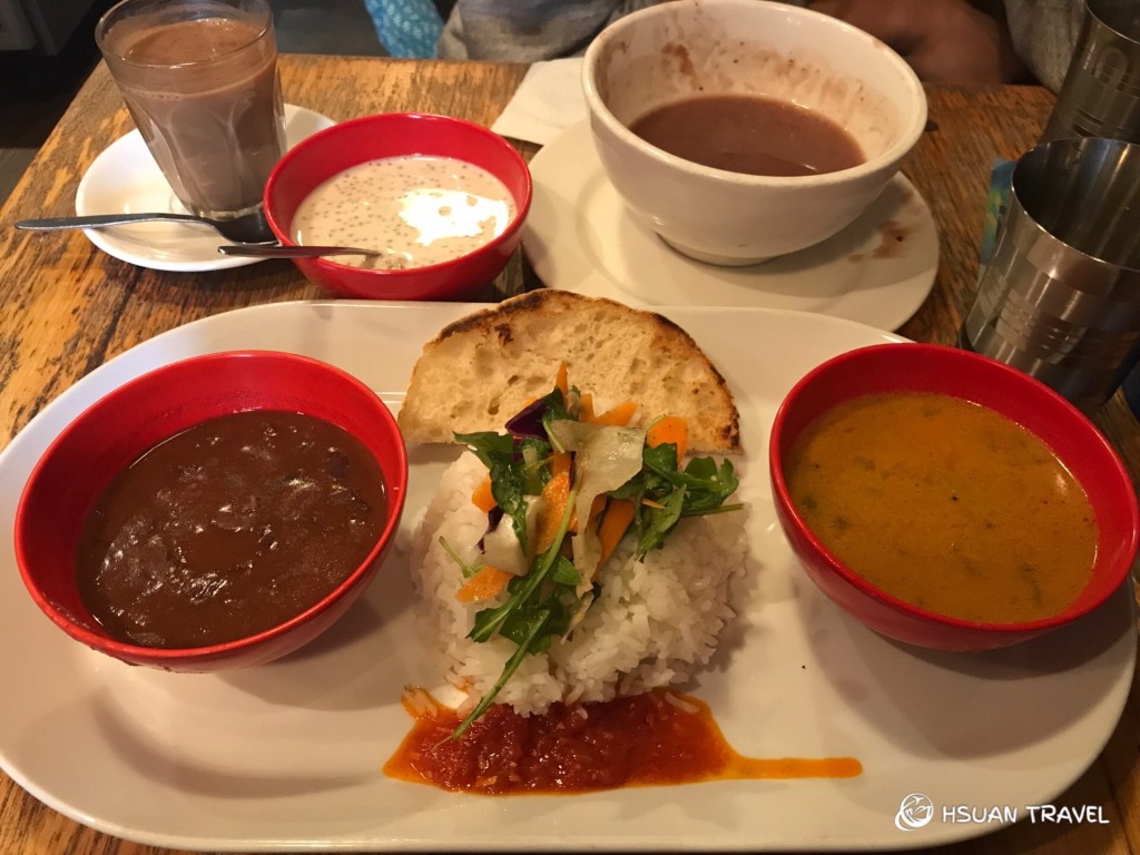 小小的菜單上,只有幾道簡單的餐點,全都是素食。我們點了一份咖喱飯,旁邊除了放一碗咖喱之外,還放了一碗應該是紅豆湯之類的東西,但是鹹的,不知道是拿來沾著飯吃的?還是直接單吃的?反正我們兩種方式都試過,味道都不錯。另外還點了一碗酸酸鹹鹹的湯、一份像是西米露的甜點、一杯充滿薑味的飲料。