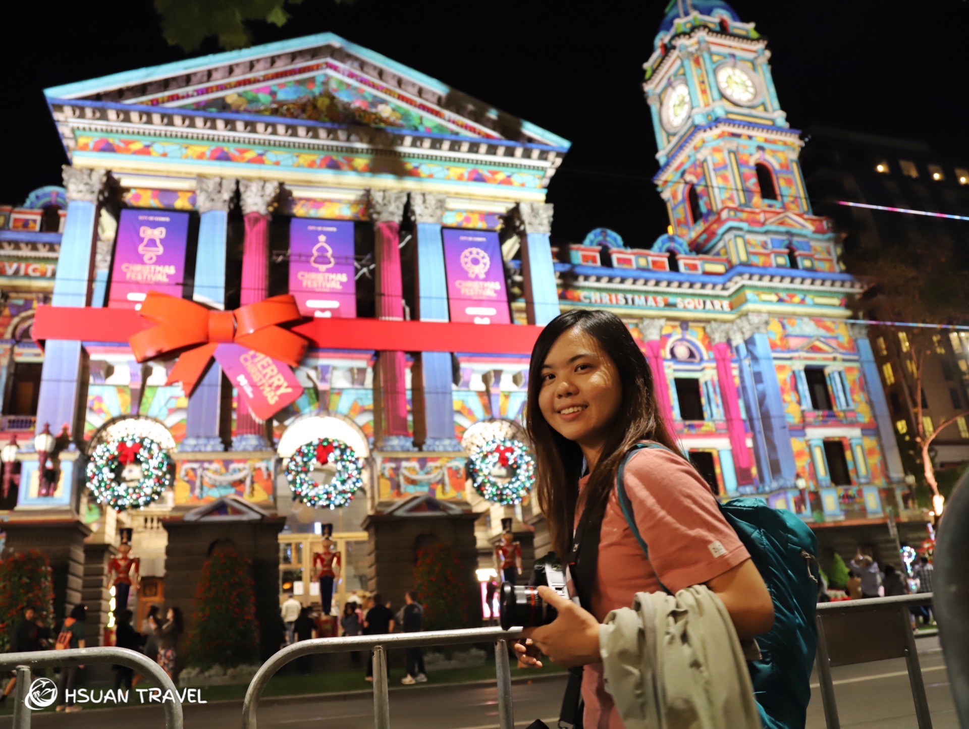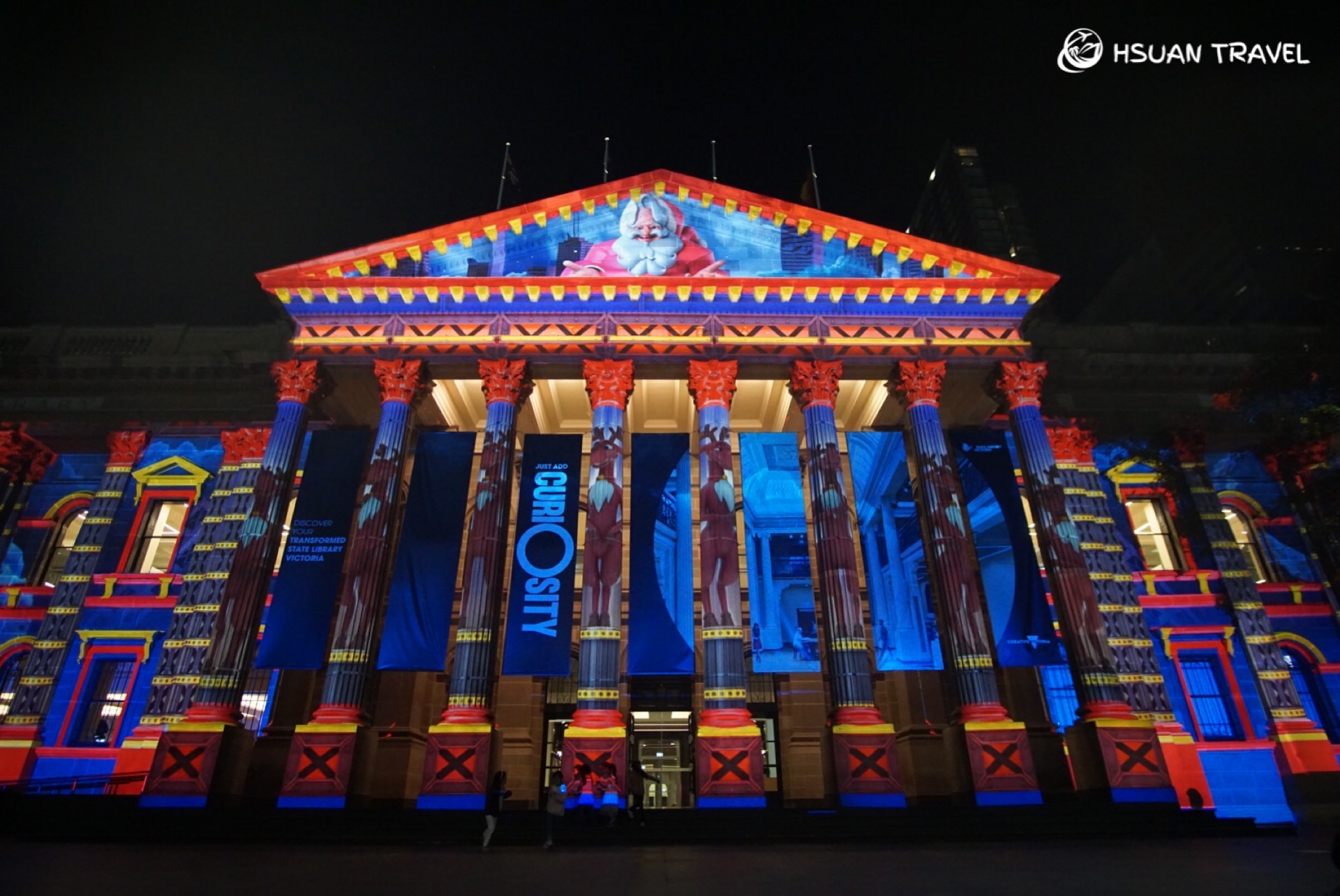 Town Hall和State Library Victoria上的繽紛裝飾是用燈光投影上去的,第一次看到這樣的呈現方式,投影的圖案完美地與建築物貼合,像是從建築物本身散發出來的。而State Library Victoria的燈光秀比較特別的是,每幾分鐘會展演一段聖誕老人送禮物的故事。故事旁白和人物對話很生動,還利用圖書館前的每一根直柱,變成送禮物的煙囪,就像在看一本會動的故事書。