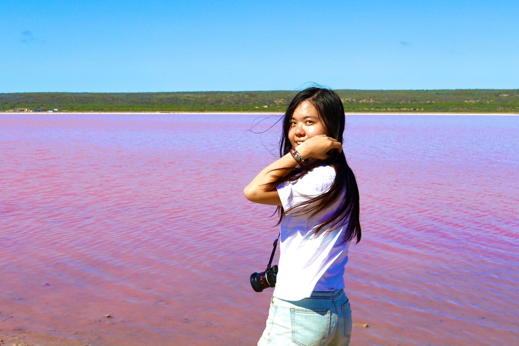 在粉紅湖前,我興奮地轉著圈,心花怒放。