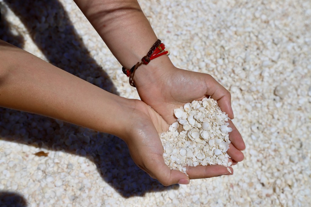 大片平緩的白沙,海水顏色從透明、碧色、水藍、湛藍⋯⋯一路漸層到天邊。海底還有一塊一塊黑色的形體,因海面波動而模糊了具體的樣貌,只見這東西連成帶狀,延伸分布整個海岸線。潛進水中才知道——是一大片珊瑚礁群。