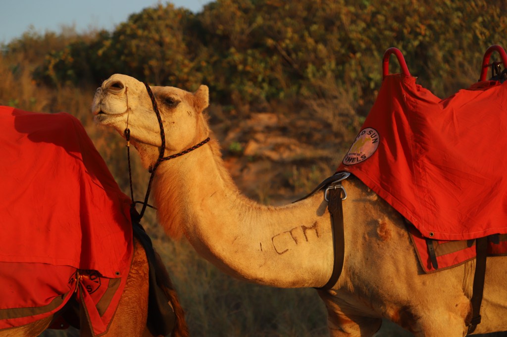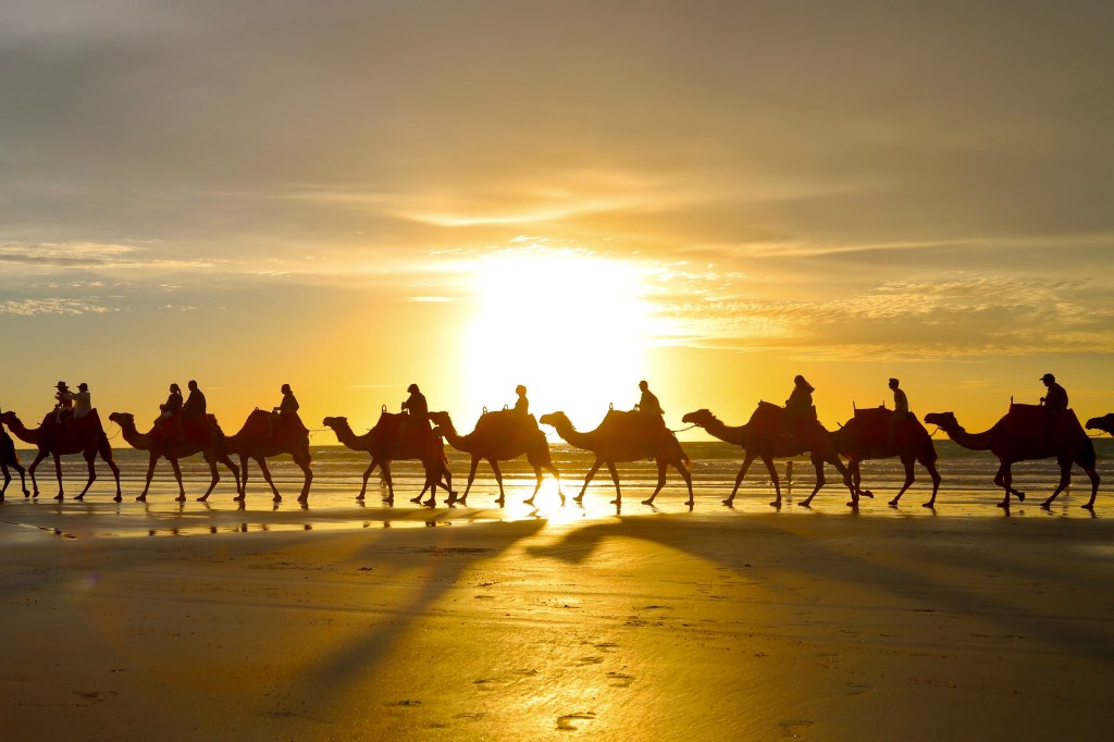 來到Broome,看看全澳最有名的駱駝騎乘地。夕陽餘暉,駱駝排成一排漫步在白沙上,多麼唯美的畫面。但我們腦海中全是⋯⋯