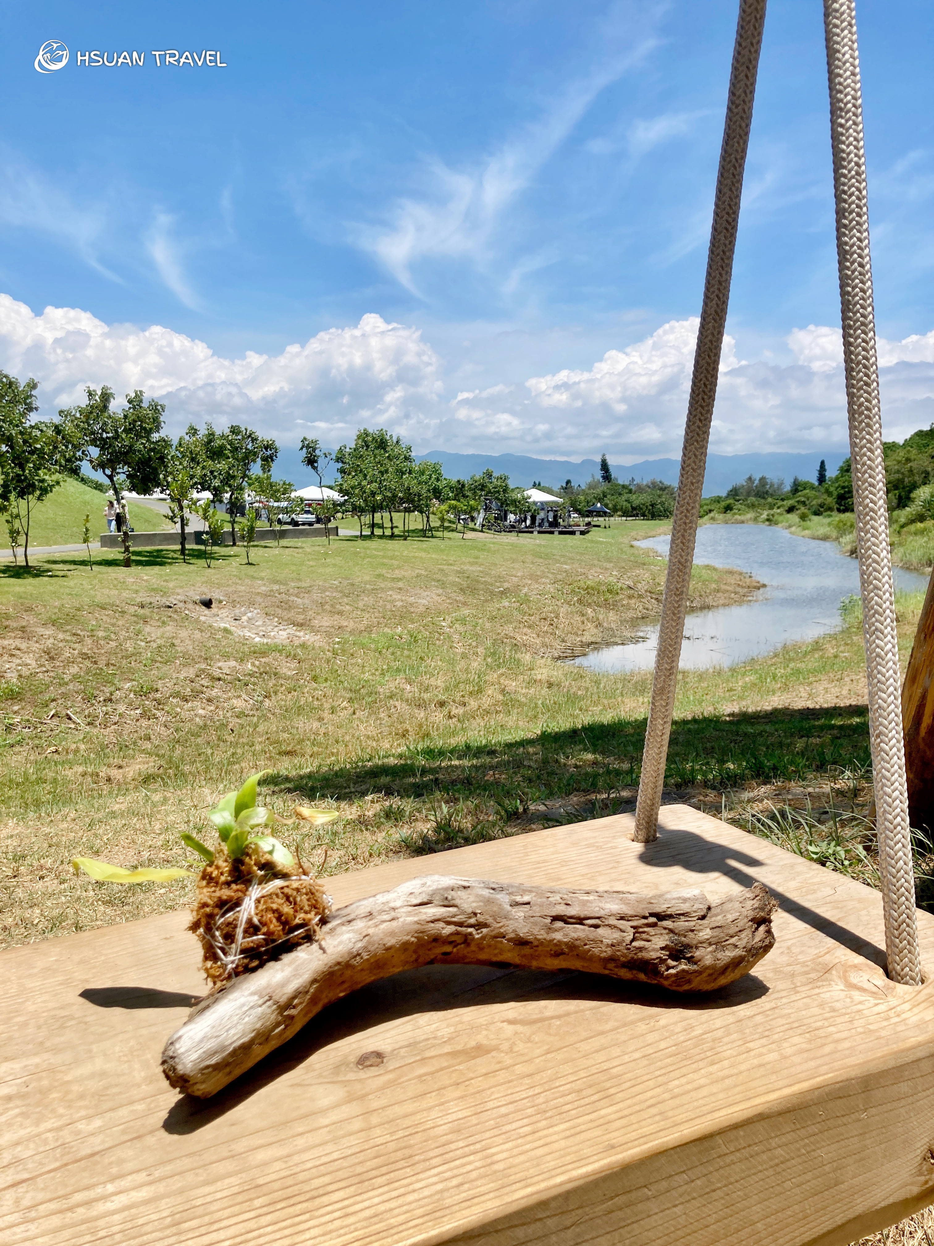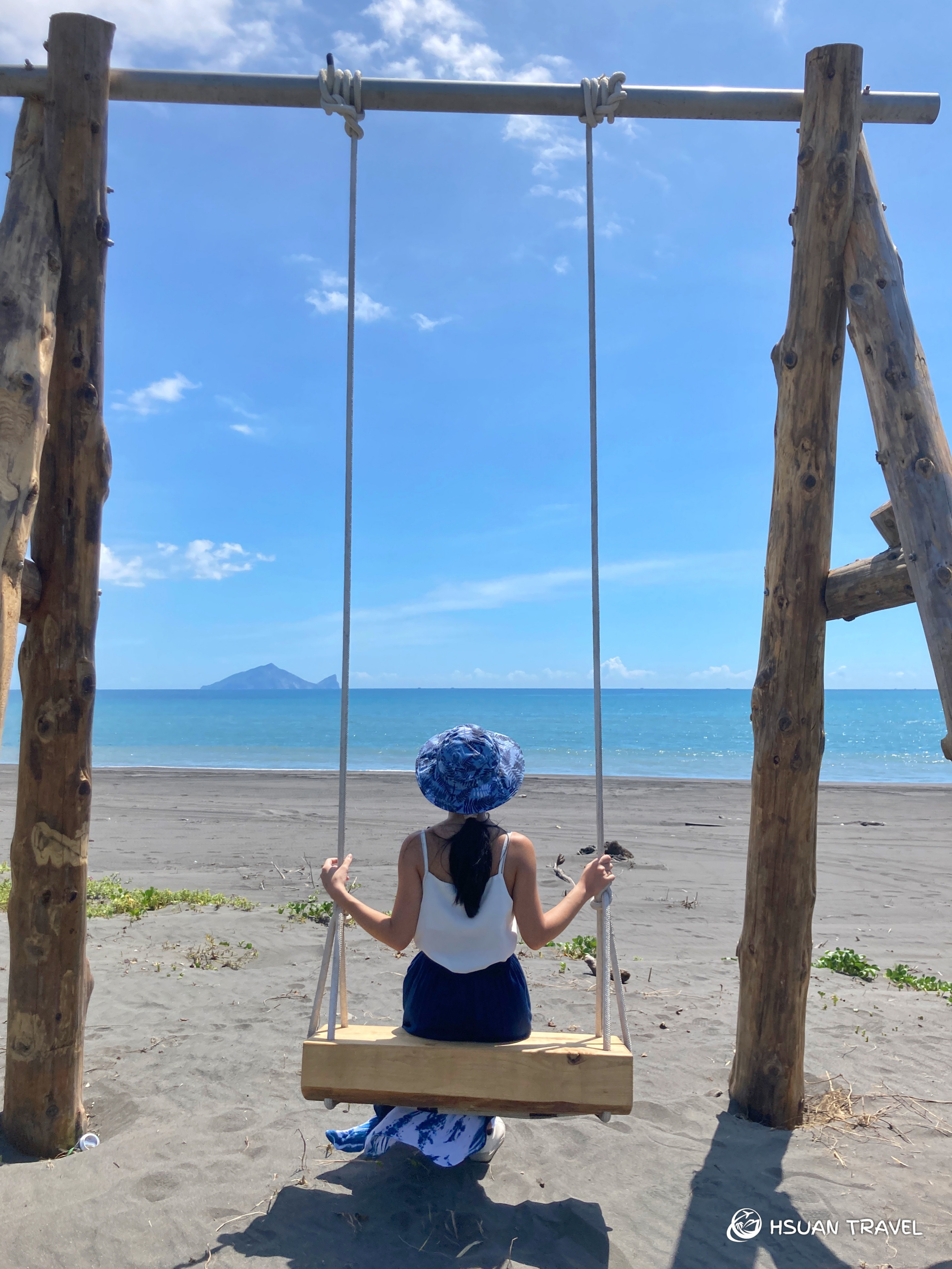 這段漂流木尋覓之路,最後來到一個座落在海岸的鞦韆,這是團隊打造的「壯圍海岸盪鞦韆」,吸引了許多人流來到這個仁愛新村旁的海岸。坐在鞦韆上,可以乘著風眺望遠方的龜山島,那個我曾經站在頂端的地方。(推薦閱讀:龜山島》登頂401高地)