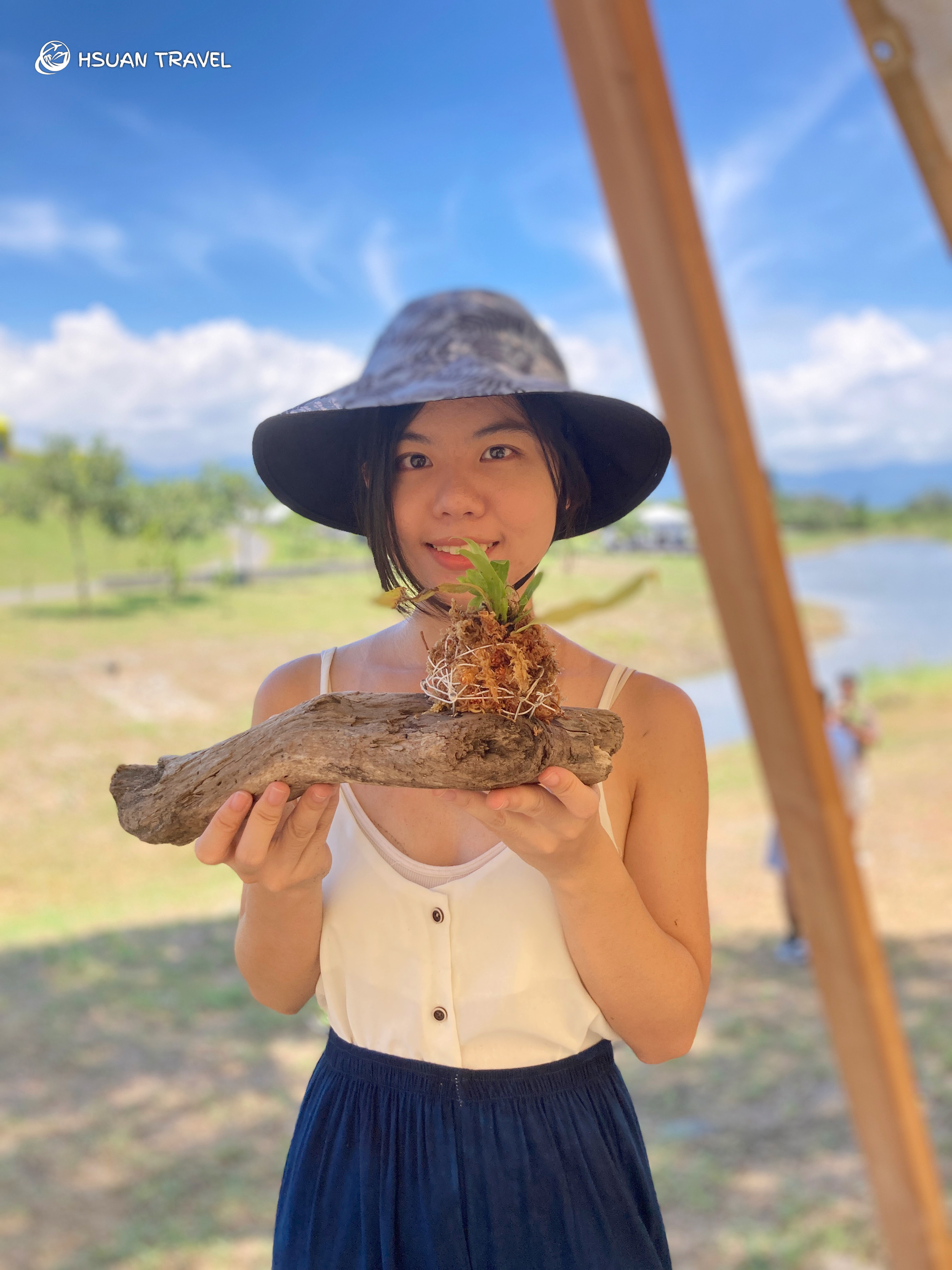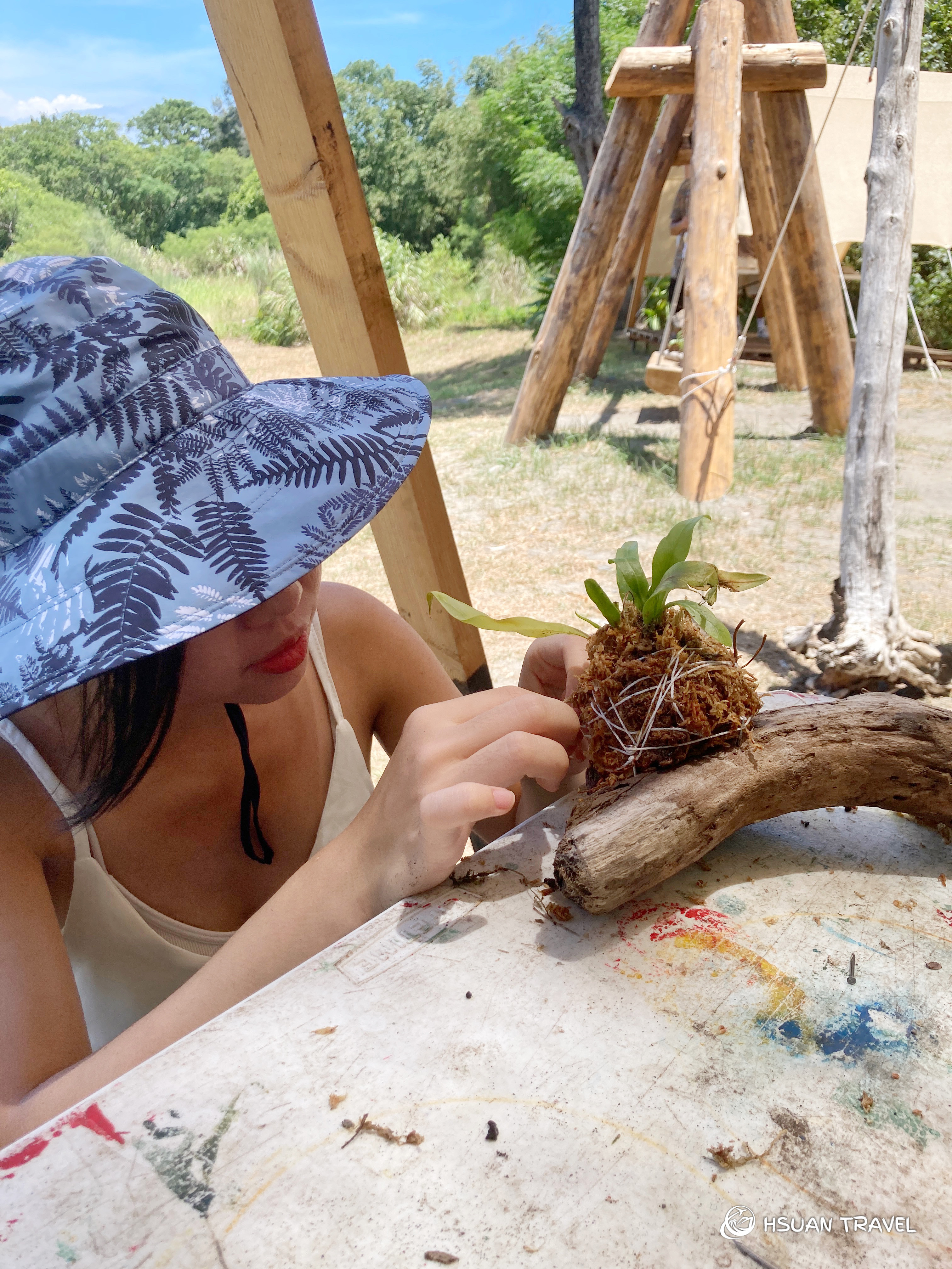 每個夥伴抱著親選的漂流木,回到壯圍沙丘旅遊服務園區。親手為木頭刷去殘沙,再從團隊準備好的一盤蕨類植物中挑選一株,並將水苔包覆外頭,在掌心裡捧成一個圓。接著在木頭上選定一個最適合這球蕨類待的地方,釘上釘子、用線纏繞固定住,一個獨一無二的居家植物裝飾就完成啦!