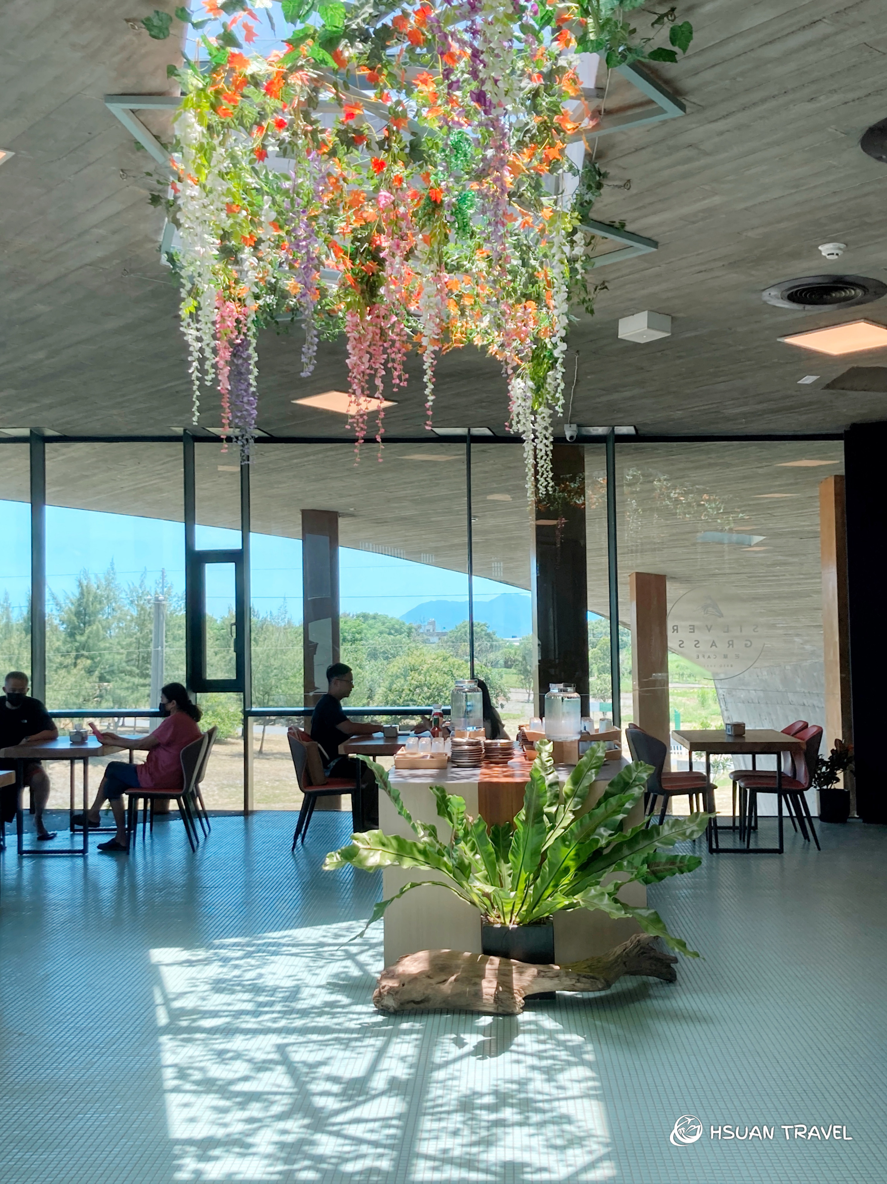 一進到餐廳我便被震懾住了,陽光透過玻璃天花板灑落,帶來滿地的花影,四周大面落地窗,整個沙丘園區的景色一覽無遺。
