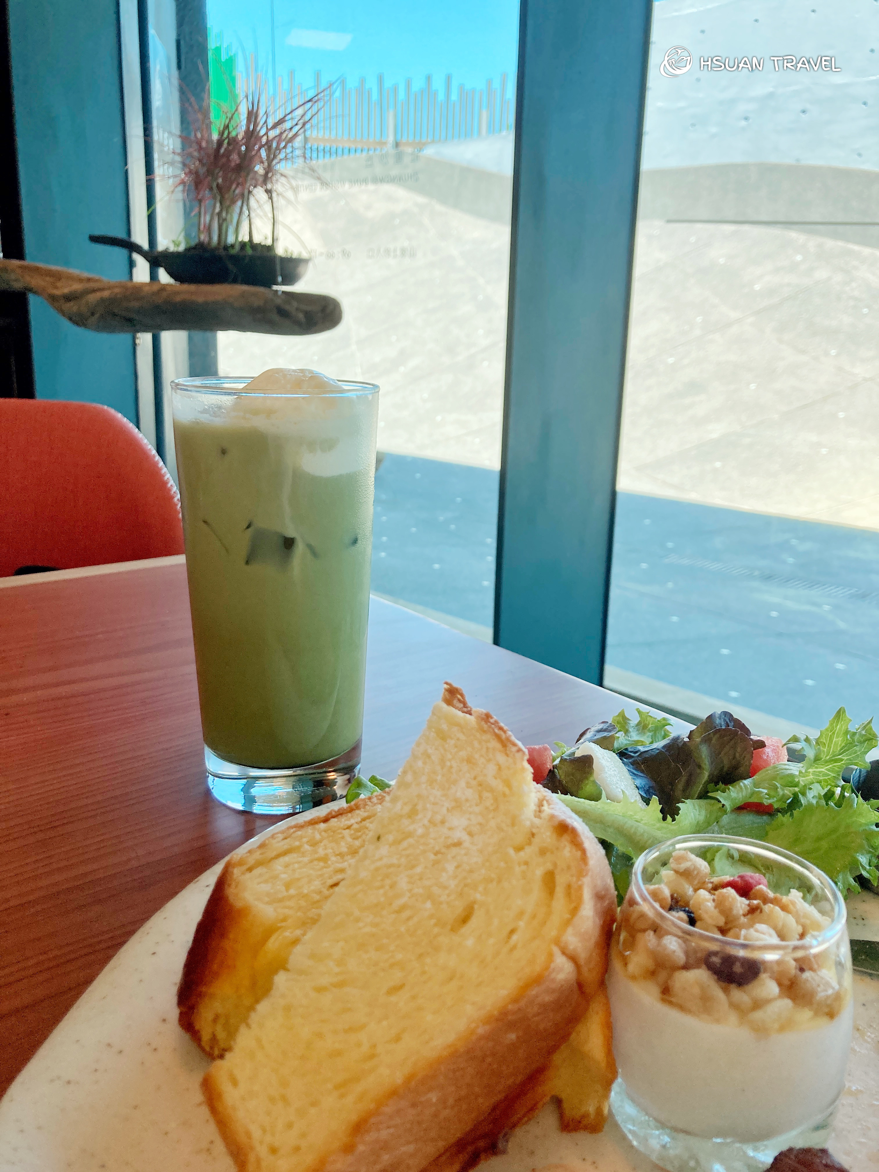 我點了一份板腱牛排早午餐和一杯漂浮抹茶拿鐵,這裡的餐點和美景比起來絲毫不遜色,軟嫩的厚切牛排、鬆軟的布里歐皇后吐司、清爽的優格鋪上滿滿的蜂蜜與果乾,美味豐盛兼具。