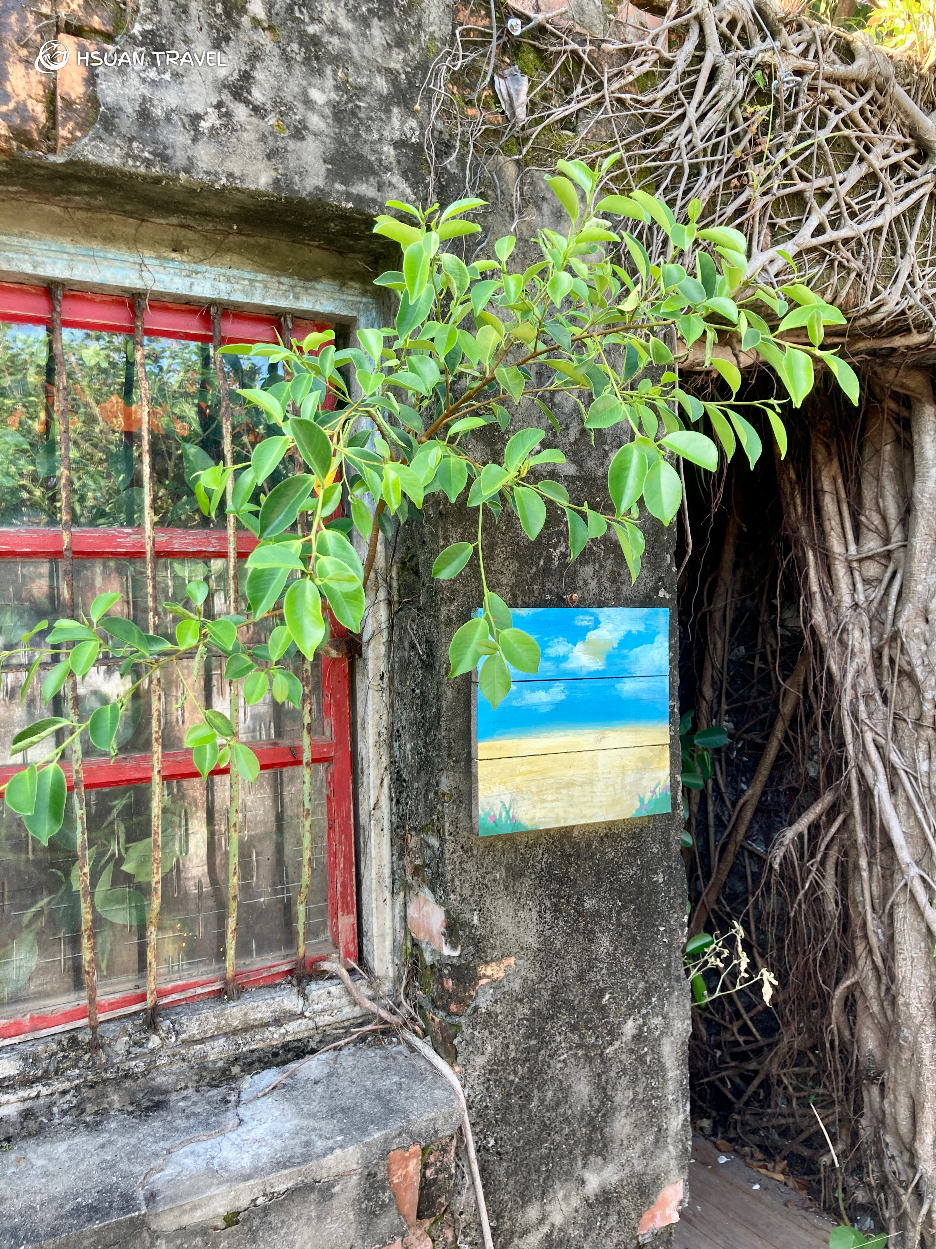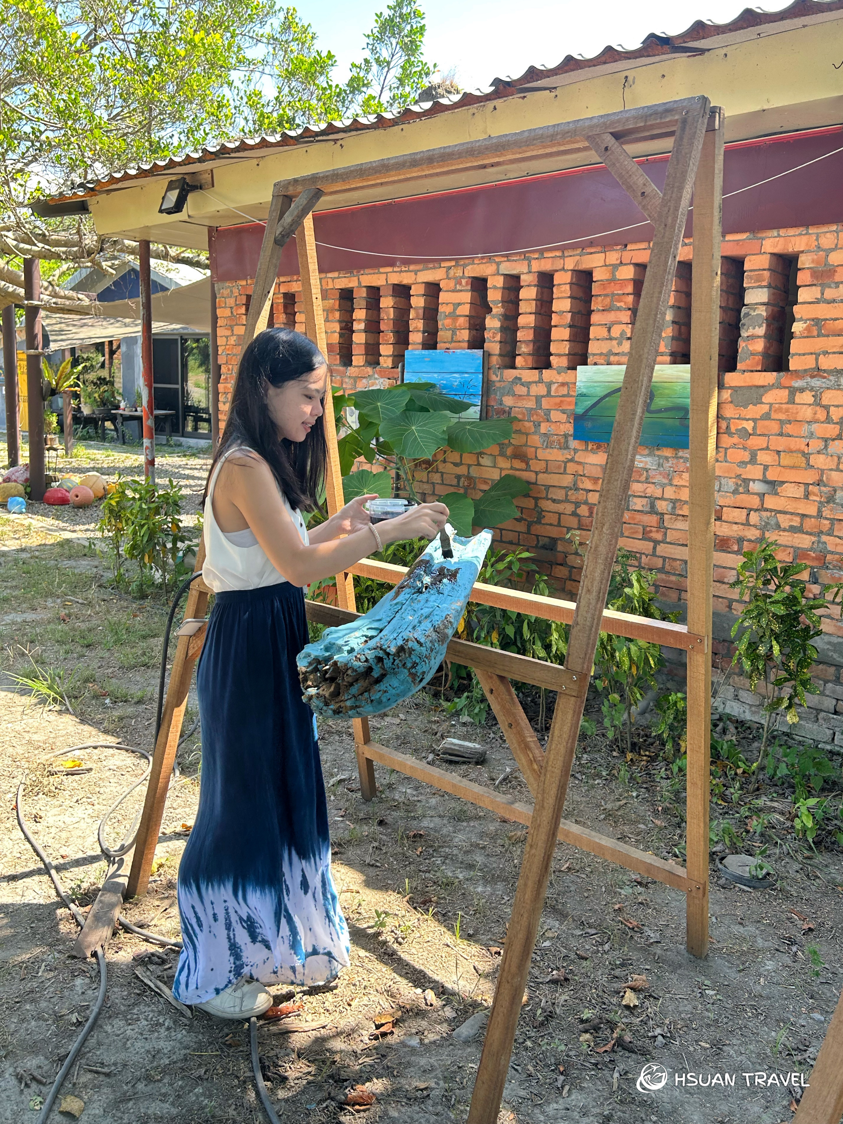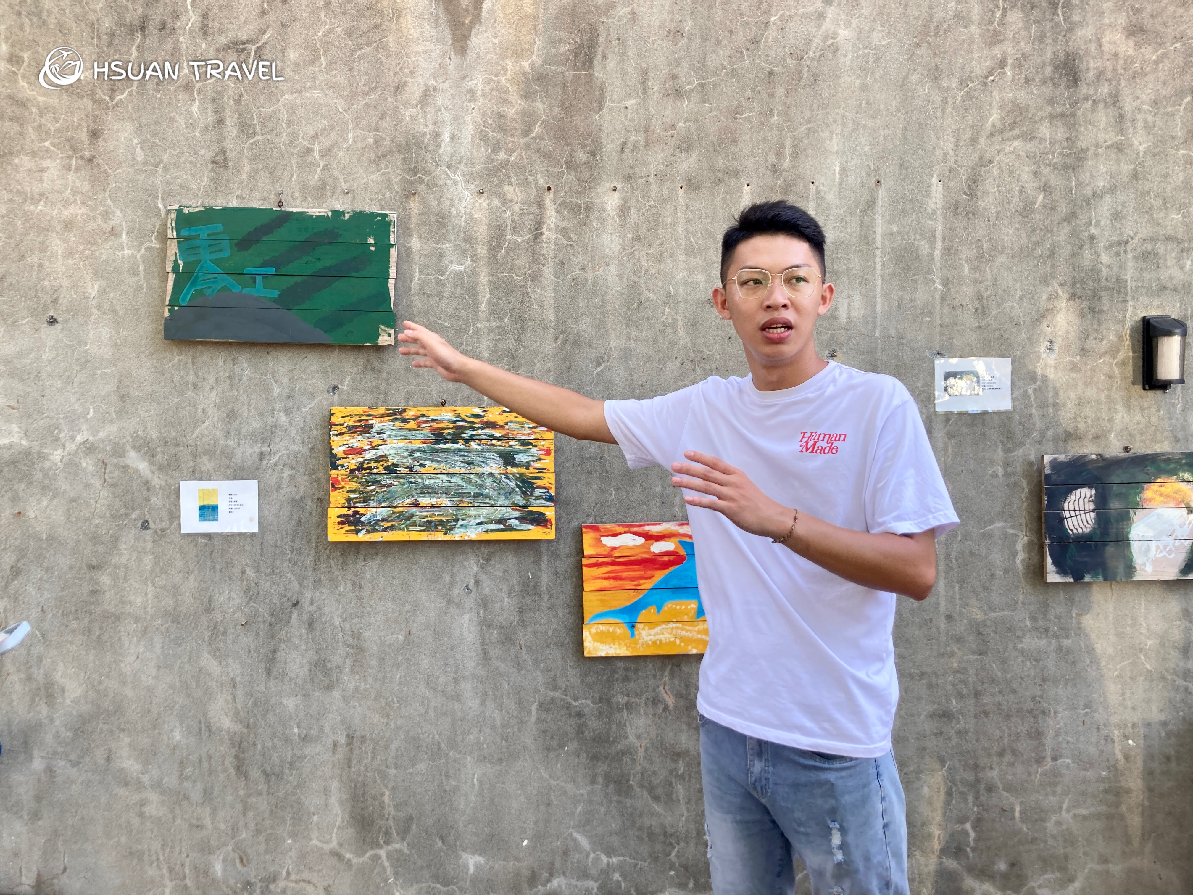 結束漂流木工作坊的三個任務,最後跟隨團隊,放慢步調細細感受仁愛新村的一磚一瓦。聚落的牆上掛了幾幅團隊創作的畫,供遊客觀賞與義賣。導覽的團隊成員很自豪地說,去年他的畫是唯一賣出去的,買畫的大哥剛從義大利回來,說他的畫很有藍洞的感覺。