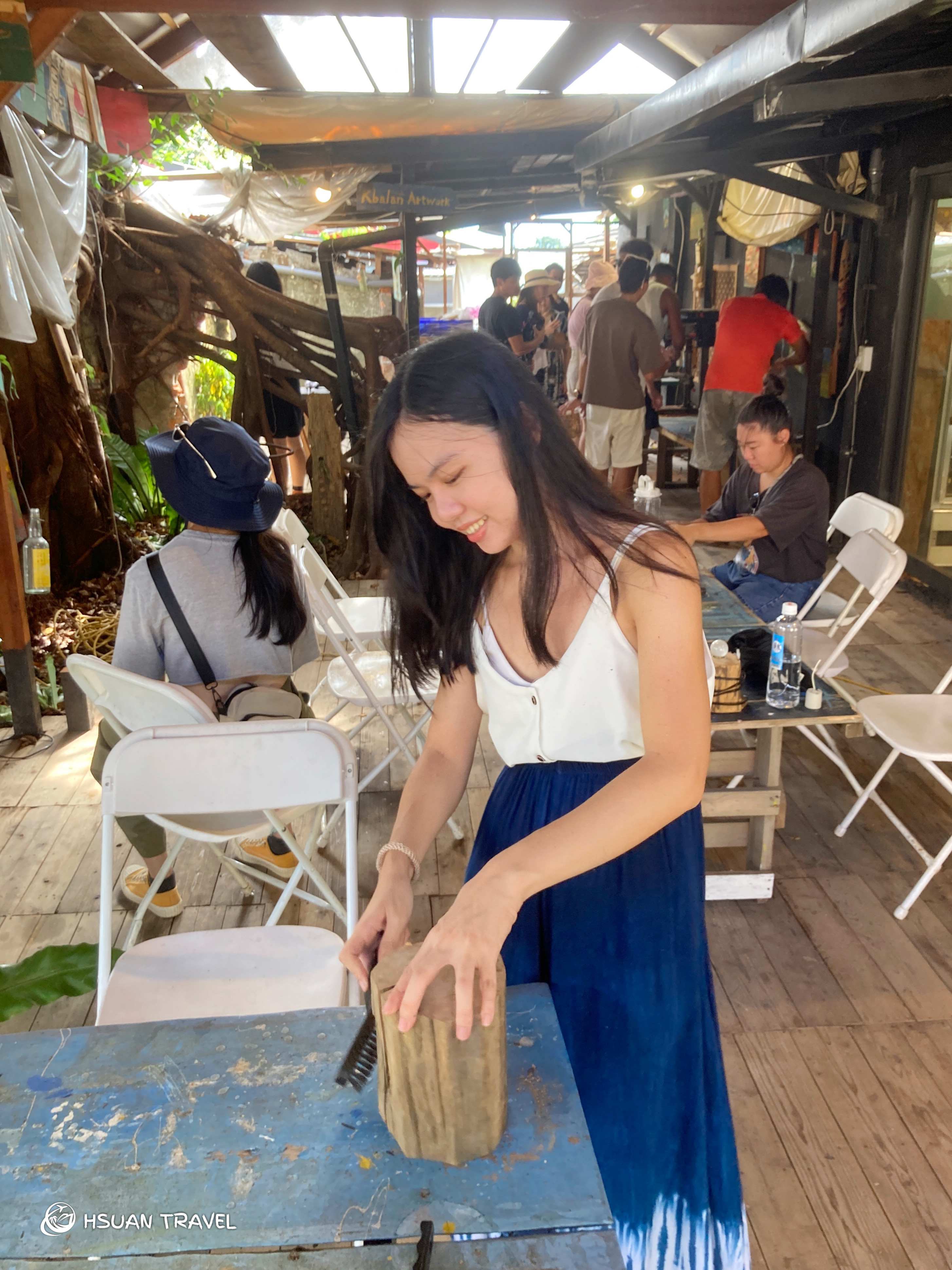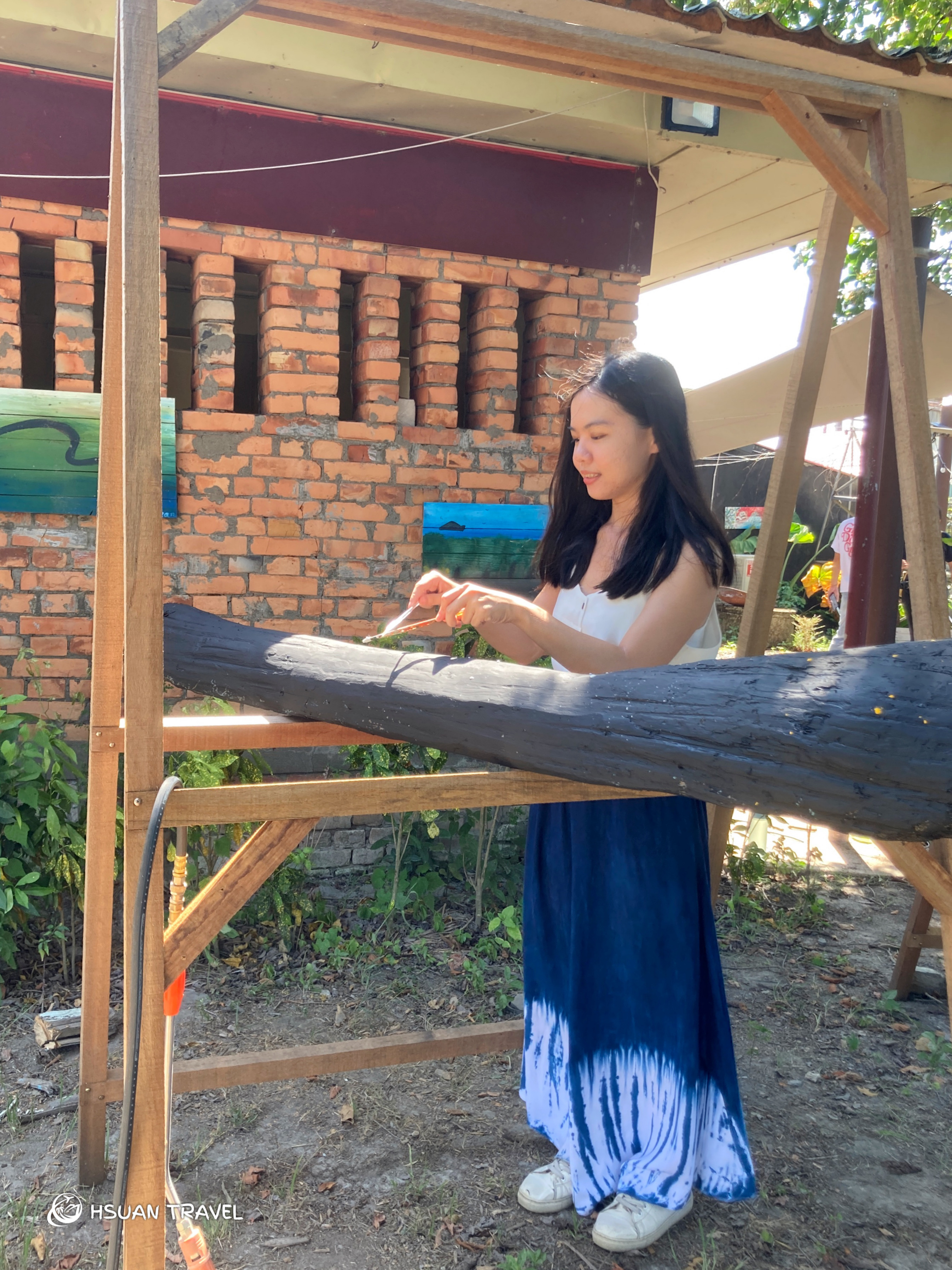 漂流木工作坊的第二個任務,是共同為漂流木換上繽紛的外衣,讓這些漂流木成為聚落的美麗藝術。首先將整隻木頭漆成黑色,再用紅、藍、黃、白幾種顏料,以敲擊的方式將顏料灑在木頭上,像五彩繽紛的星空一樣。顏料隨機噴灑,在漂流木上呈現特殊的形狀與分佈,每個夥伴創作出來的木頭皆有獨特的樣貌,這就是藝術共創的魅力與迷人之處。