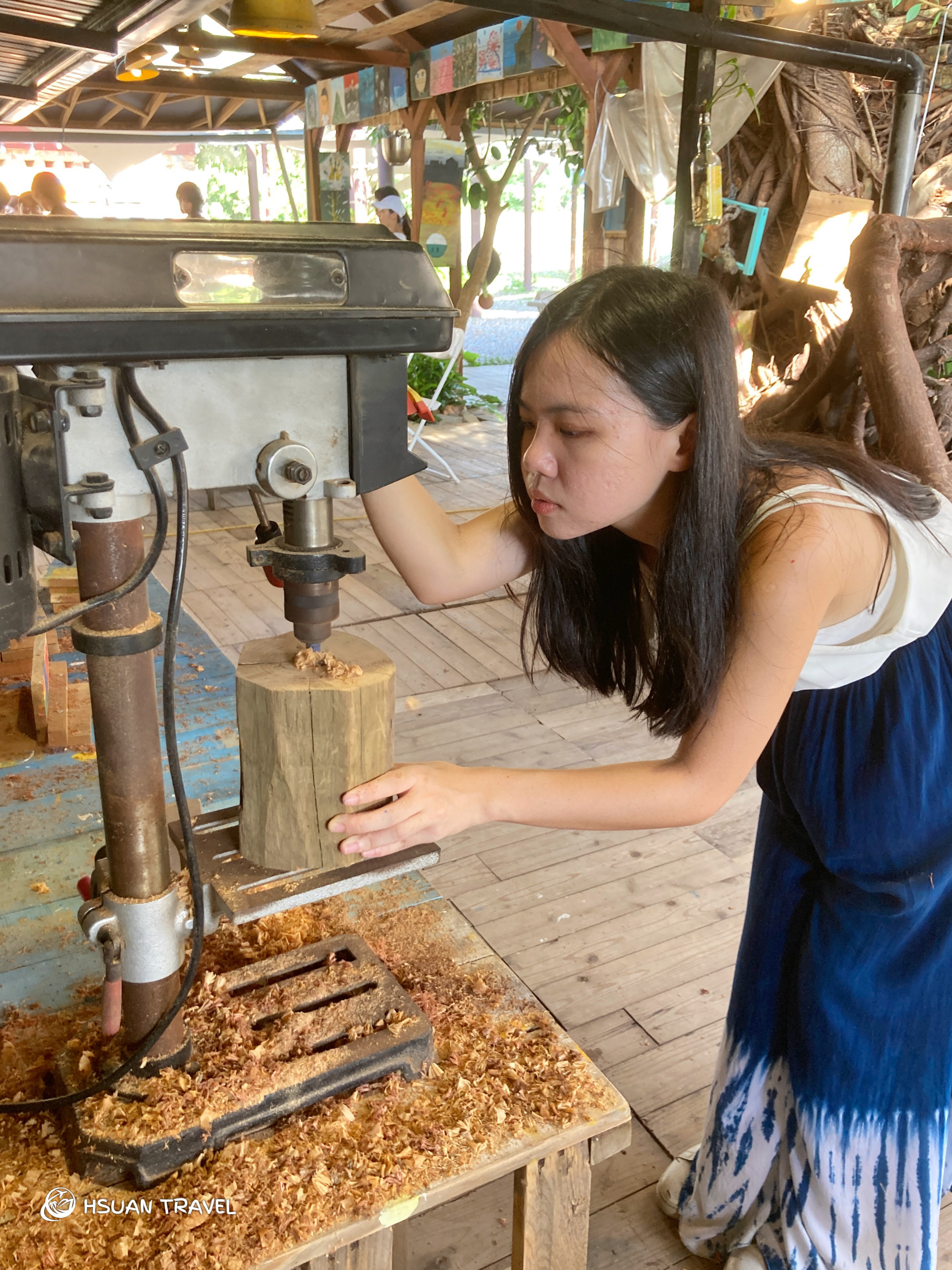 很充實地迎來漂流木工作坊的第三個任務,夥伴們各自從團隊預先整理好的木頭裡,挑選喜愛的形狀。先為木頭刷去表面的木屑,接著將表面磨光滑,然後在想放燈泡的位置鑽一個洞,最後放上燈泡、接上電線,就成了可以放在家中,散發溫暖微光與木頭香氣的小燈。木工初體驗,第一次操作這些儀器,親手將漂流木打造成專屬的燈具,顯得格外有溫度。